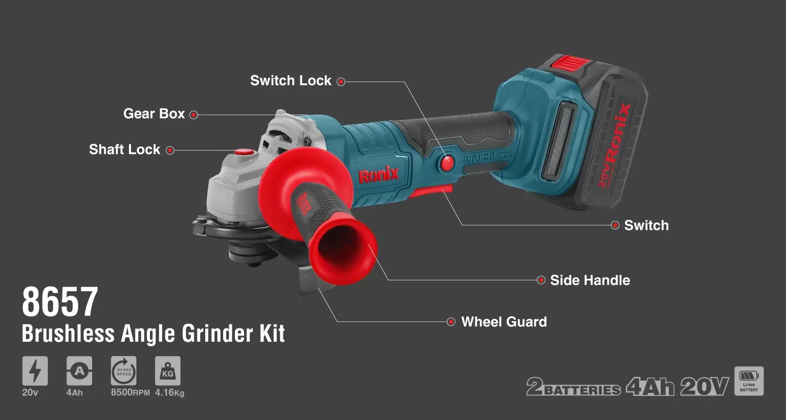 უსადენო უნახშირო კუთხსახეხი (ბარგალკა) Ronix-8657 20V 125მმ
