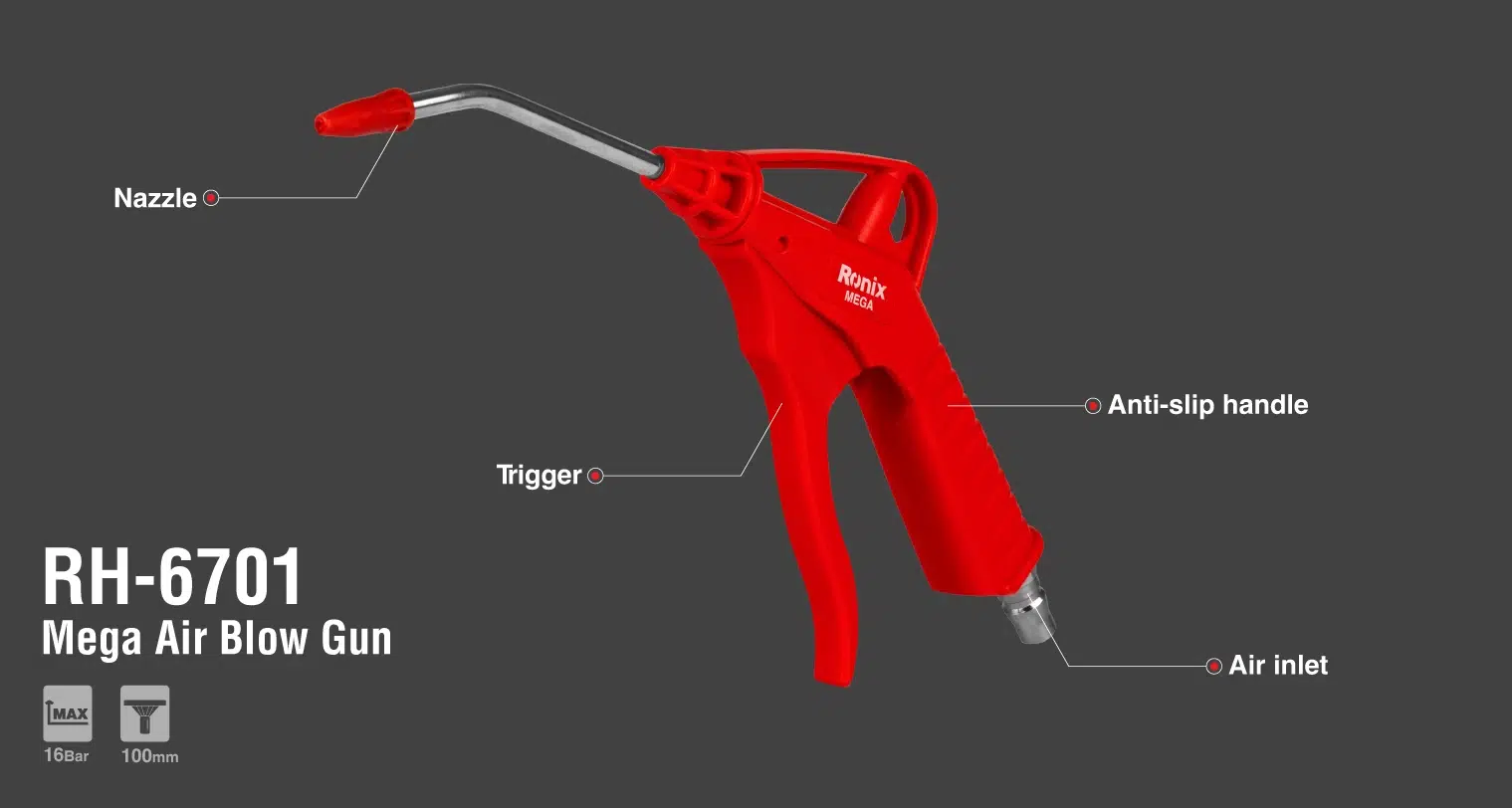 პნევმატური პისტოლეტები არის ხელსაწყოები, რომლებიც იყენებენ შეკუმშულ ჰაერს ჰაერის ძლიერი ნაკადის წარმოსაქმნელად, რომლის გამოყენებაც შესაძლებელია სხვადასხვა ზედაპირებისა და აღჭურვილობის გასაწმენდად, გასაშრობად ან გასაგრილებლად. ისინი ხშირად გამოიყენება საავტომობილო და სამრეწველო გარემოში, ასევე სახელოსნოებსა და ავტოფარეხებში. Ronix RH-6701 პნევმატური პისტოლეტი არის უმაღლესი ხარისხის ხელსაწყო, რომელიც შექმნილია კომერციული და სამრეწველო გამოყენებისთვის. შთამბეჭდავი ნაკადის სიჩქარით, რომელიც წუთში 500 ლიტრს აღწევს და მაქსიმალური წნევის 16 ბარს აღწევს, ეს პნევმატური იარაღი ადვილად უმკლავდება ყველაზე მომთხოვნ სამუშაოებსაც კი.