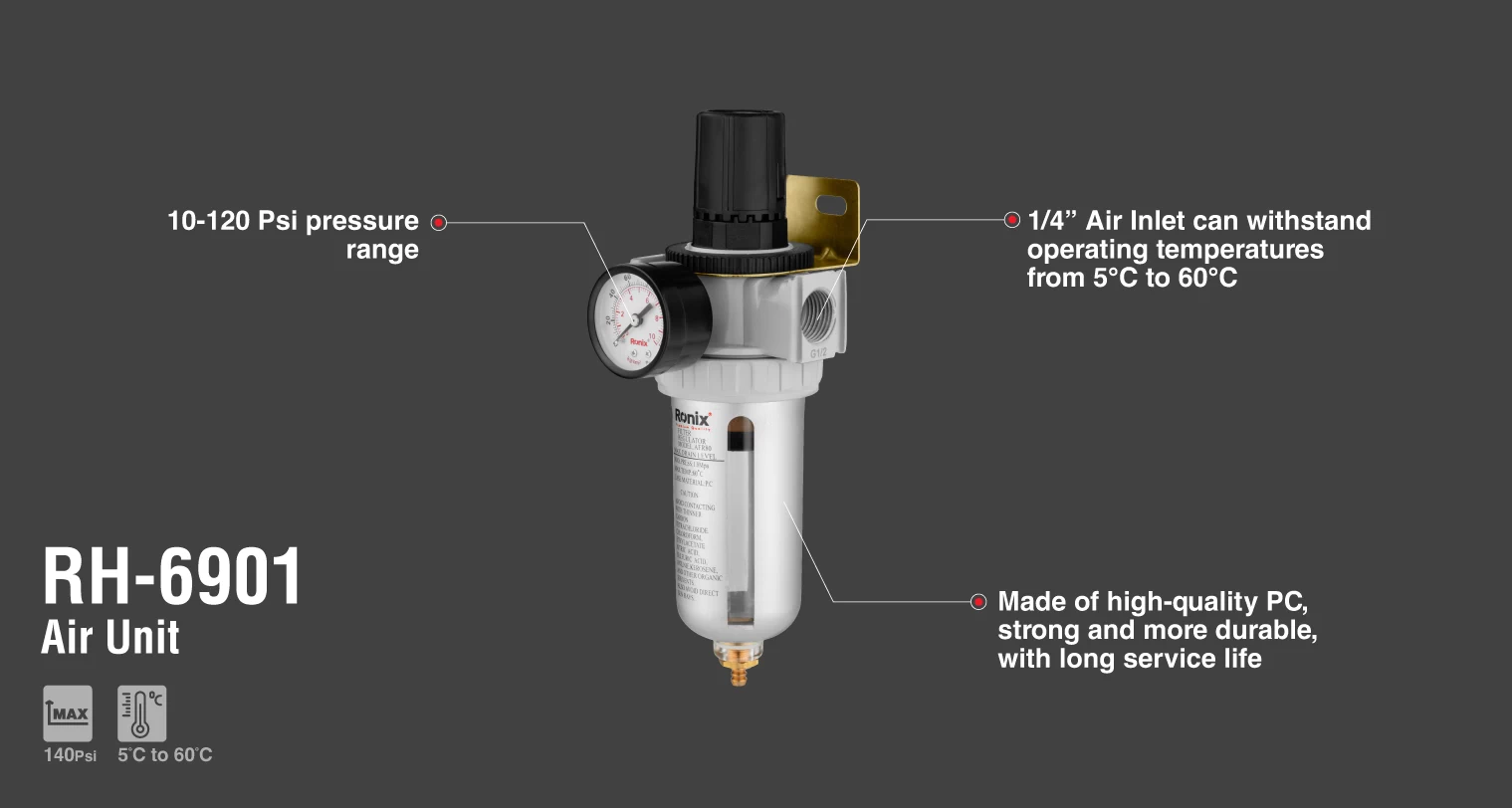 ეს ინსტრუმენტი ძირითადად აშორებს მყარ ნაწილაკებსა და კონდენსატს შეკუმშული ჰაერით და აწვდის სათანადო მშრალ ჰაერს პნევმატურ აპლიკატორებს. RH-6901 აღჭურვილია ზუსტი მანომეტრით და ღილაკით. ეს ღილაკი საშუალებას გაძლევთ დაარეგულიროთ ჰაერის წნევა 10-120 Psi დიაპაზონში თქვენი დავალების შესაბამისად. თითქმის ყველა ჰაერის კომპრესორს აქვს საგანგებო გამორთვის სისტემა ჭარბი წნევის შემთხვევაში. ამგვარად, ეს ფილტრები შექმნილია 140Psi მაქსიმალური წნევის ასატანად გამორთვის სისტემის გაუმართაობის შემთხვევაში.