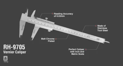 ♦ მოდელი RH-9704 გთავაზობთ 0.03 მმ-იან წაკითხვის სიზუსტეს ვერნიეს შკალით.